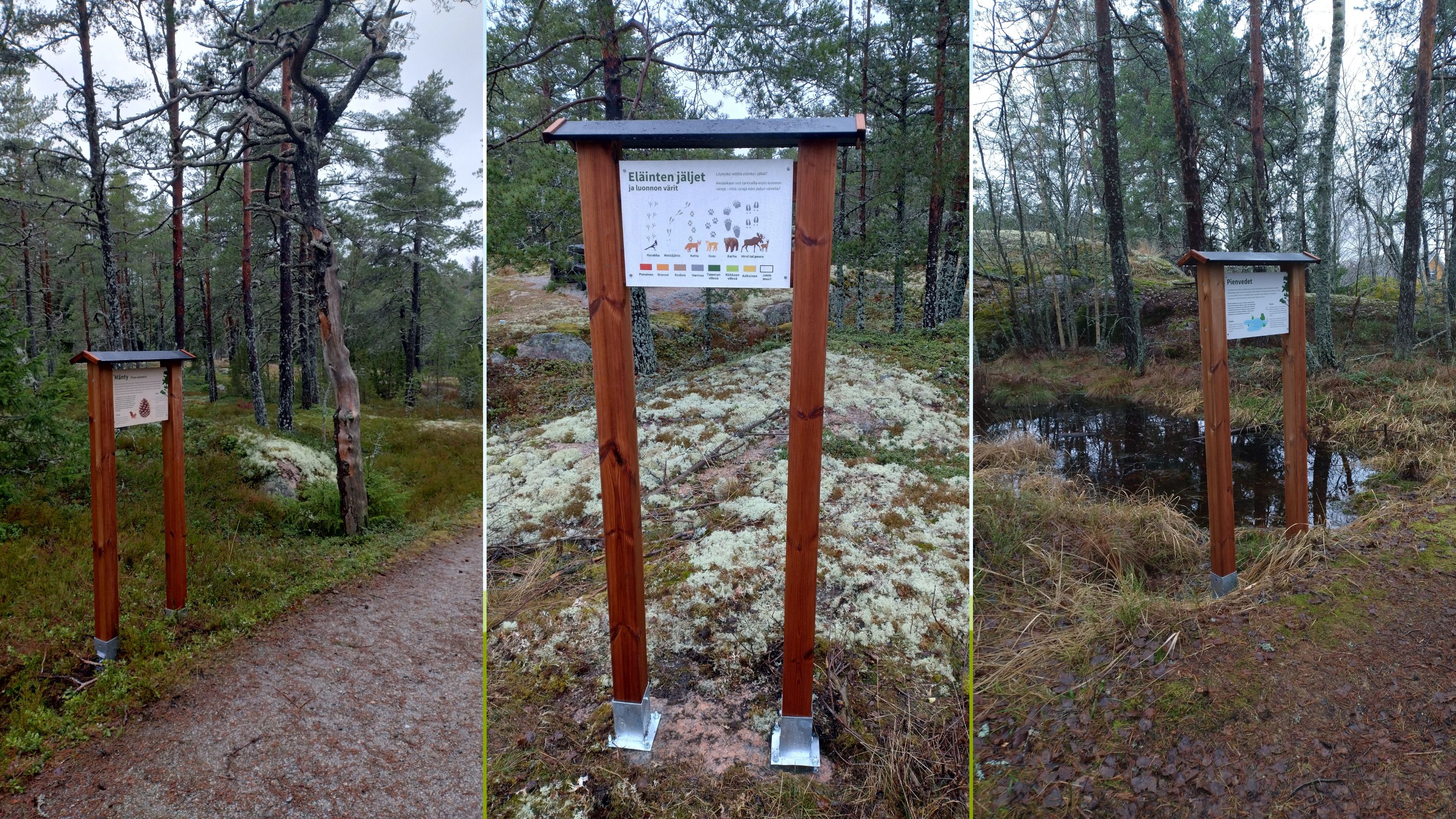 Luontopolun varrelle sijoitetut taulut muodostavat lapsille suunnatun kokonaisuuden, jossa tutustutaan metsän elämään aisteilla, keholla ja uteliaisuudella. Jokainen taulu johdattaa eri aiheeseen, liittyen esimerkiksi kiviin, eläimiin, kasveihin, veden kiertokulkuun tai vuodenaikoihin. Taulut eivät ainoastaan anna tietoa – ne kutsuvat pysähtymään, katsomaan lähelle ja osallistumaan.