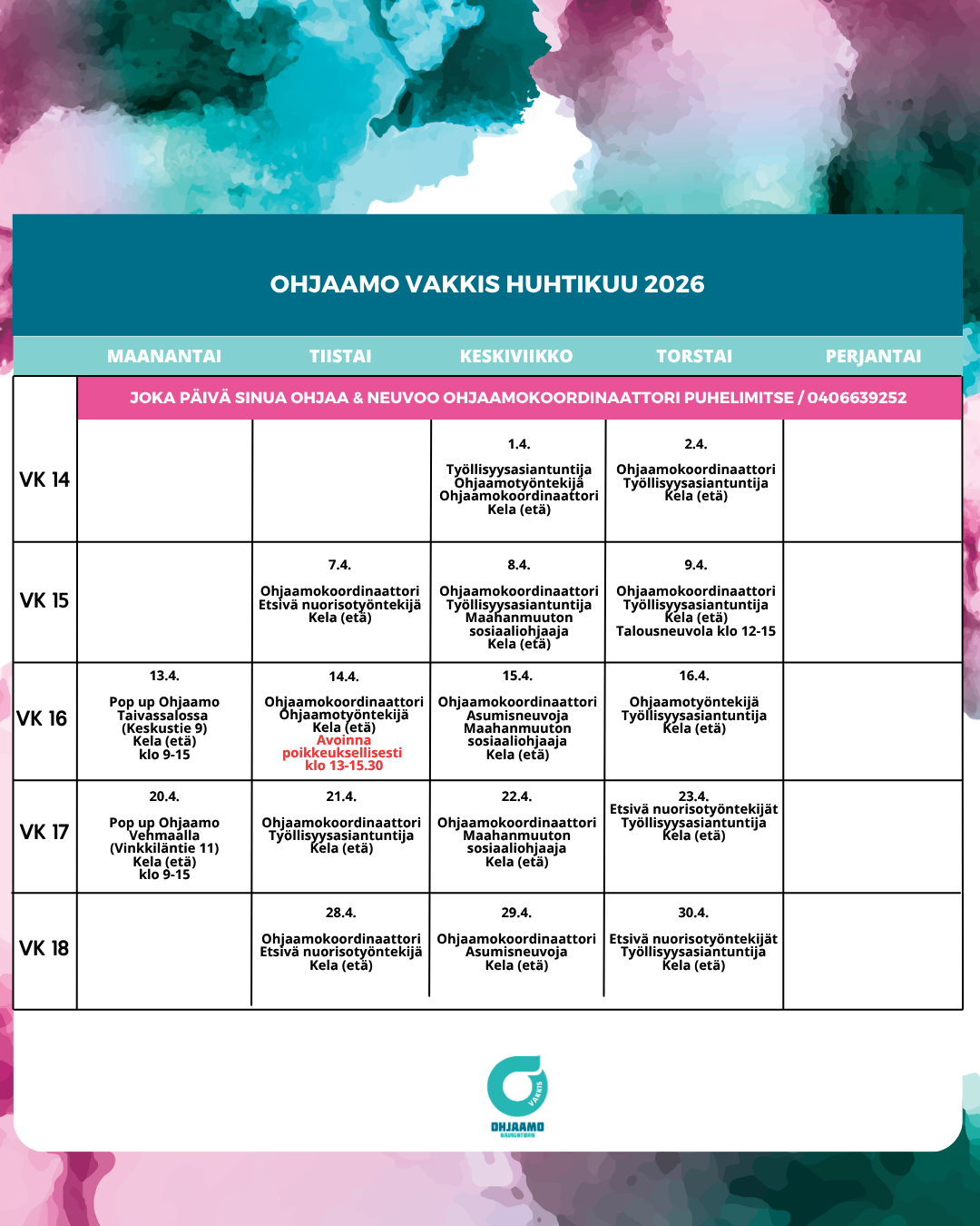 Ti - pe 9:00-15:00 Kelan etäasiointipiste Ohjaamo Vakkiksessa os. Vuorikatu 11 (aamupäivisin ajanvarauksella)