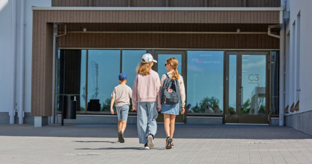 Kolme lasta kävelee kohti koulurakennusta aurinkoisena päivänä.