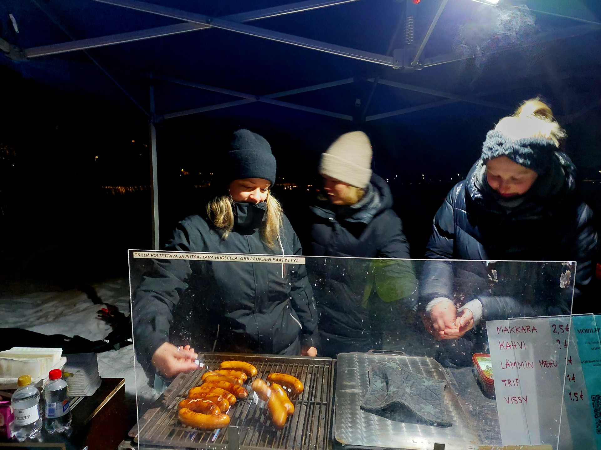 Tapahtuman makkaramyynti kävi vilkkaana koko illan ajan. Jääkotkien taitoluistelijoiden järjestämä myyntipiste palveli kävijöitä huimaa vauhtia, ja grillistä nousi tasaisena virtana höyryävää herkkua. Myös omatoimigrilli oli kovassa käytössä, ja monilla oli mukana omat eväät, joita paistettiin iloisessa seurassa. Grillipaikka pysyi kuumana koko tapahtuman ajan, mikä kertoi kävijöiden suuresta määrästä ja aktiivisesta osallistumisesta.